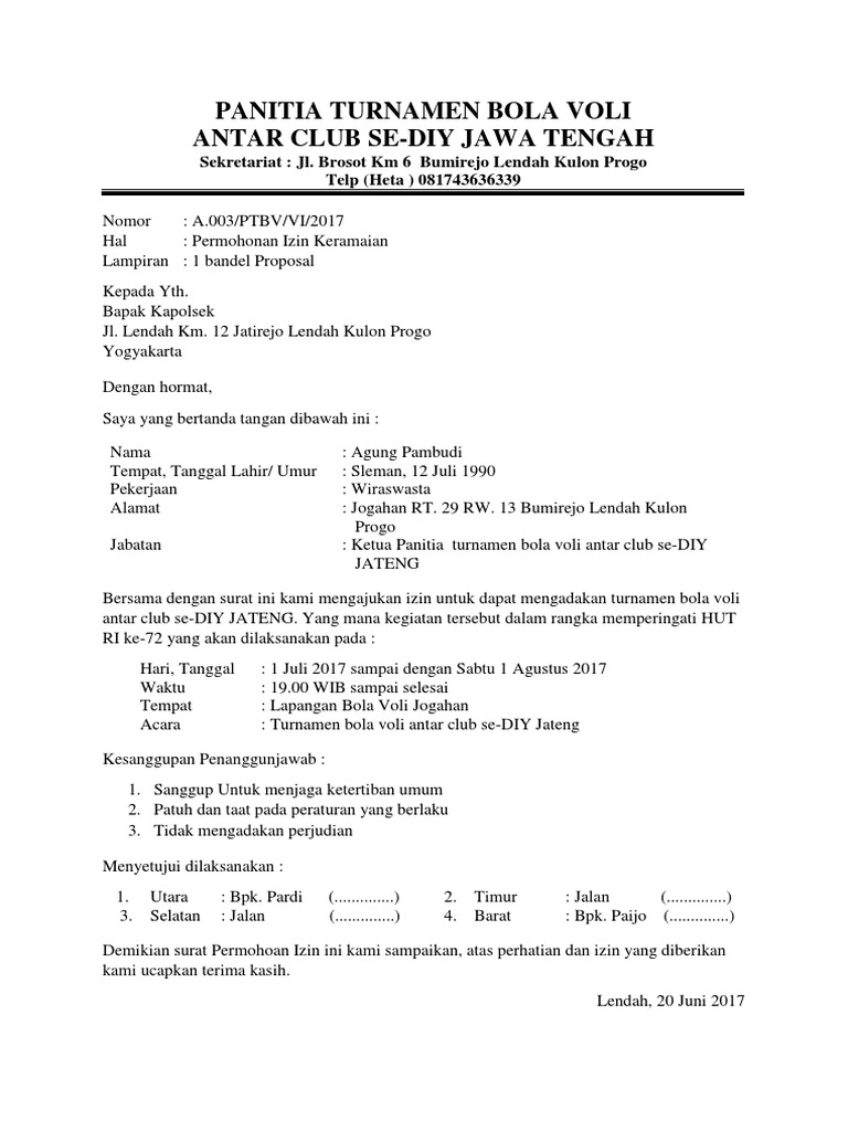 Dalam mengadakan acara turnamen, surat izin keramaian sangat penting untuk dipenuhi. Surat ini memastikan bahwa acara berlangsung dengan aman dan sesuai dengan peraturan yang berlaku. Oleh karena itu, sebelum mengadakan acara, pastikan untuk sudah memperoleh surat izin keramaian yang diperlukan.